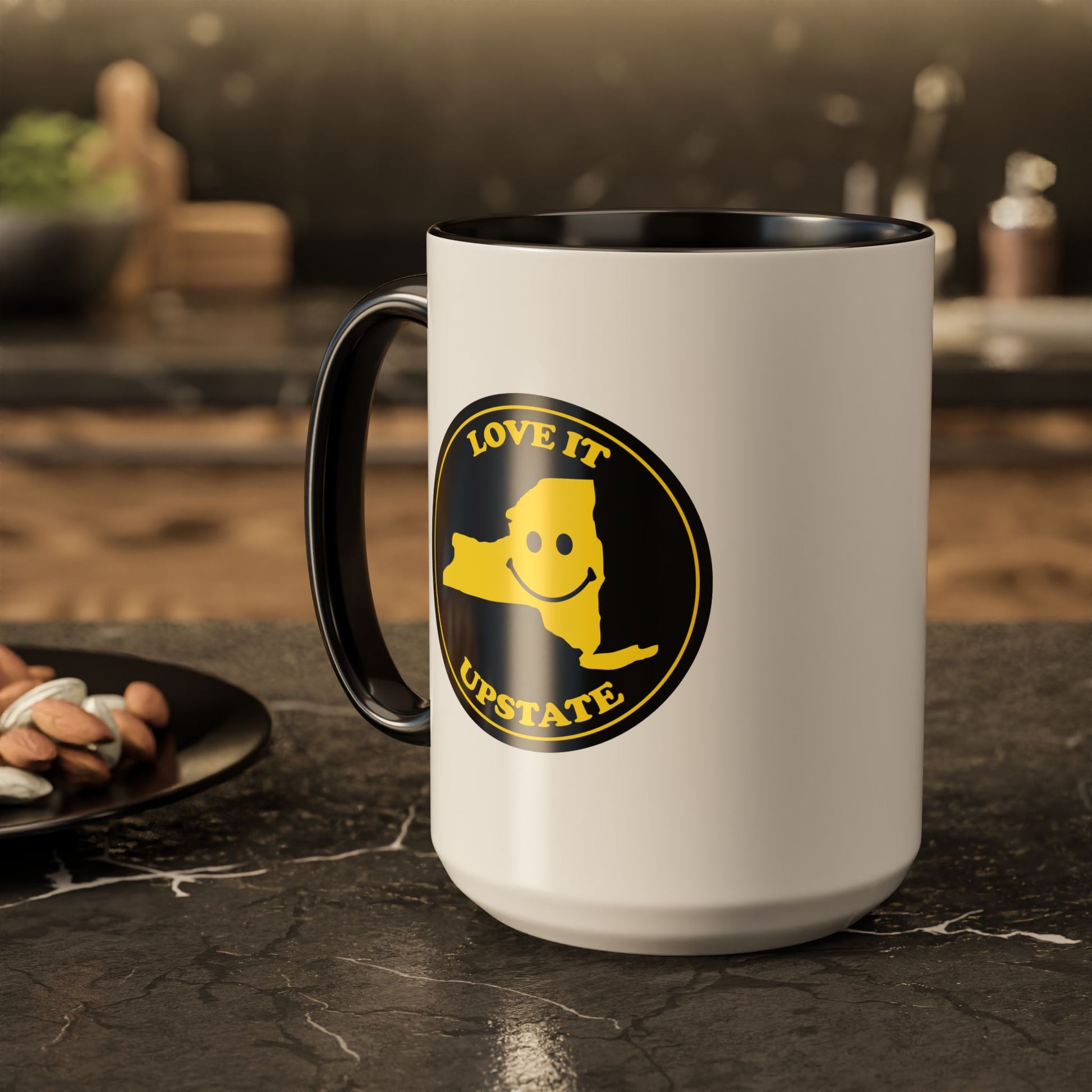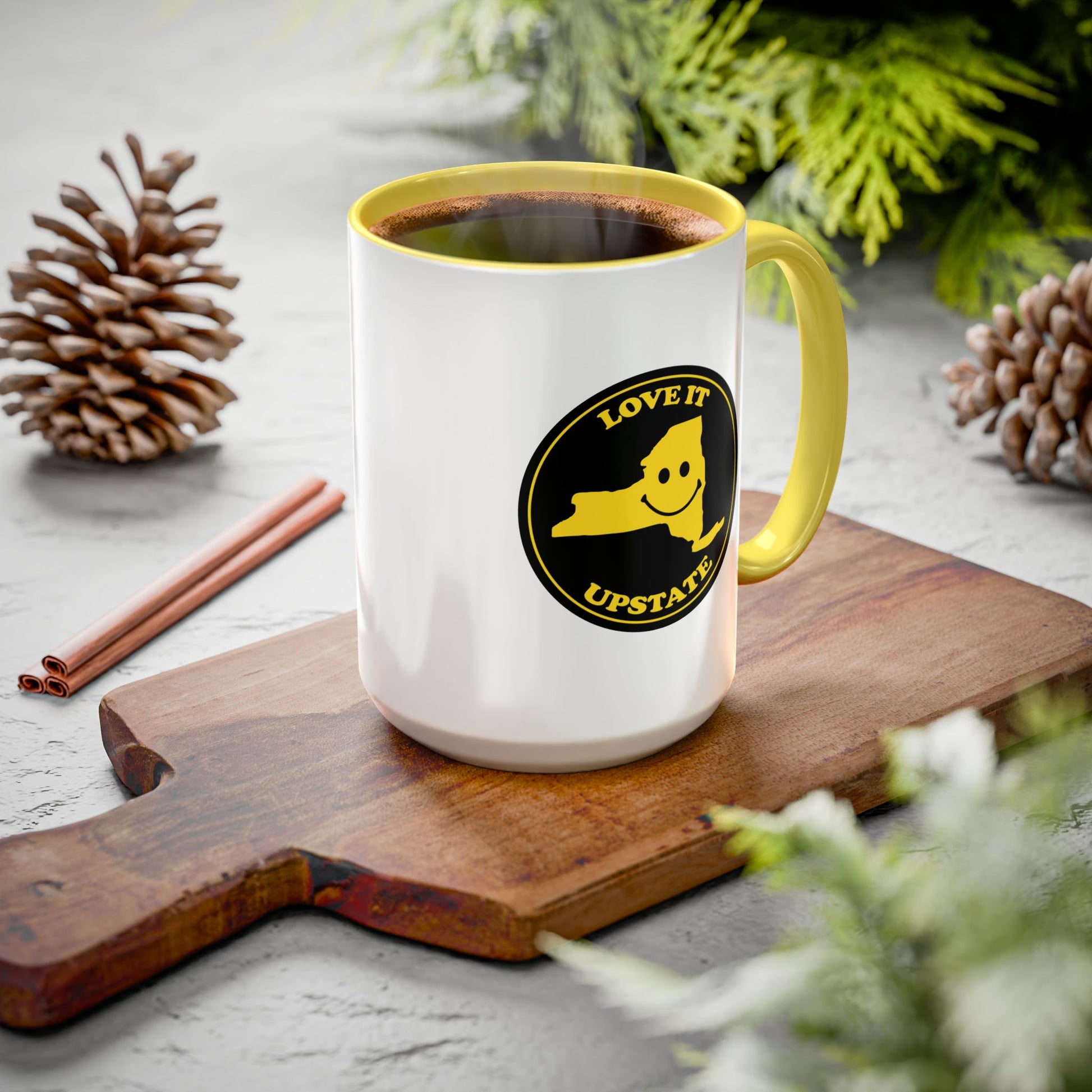 This glossy ceramic mug brings a playful, hometown-hearted touch to morning routines. The design features a cheerful silhouette of New York’s upstate region with a smiling face and the phrase “Love It Upstate,” printed in bright, vintage-inspired colors that pop against the white body and contrasting interior and handle. Choose from 12 accent hues and two sizes (11oz or 15oz) to match your style. The mug’s ORCA coating preserves crisp color detail and a glossy finish, while the comfortable C-shaped handle makes it easy to hold during long sips. It stands up to daily use — safe for dishwashers and microwaves — so it stays bright through morning coffee runs, late-night study sessions, or relaxed weekends in a cozy cabin or city loft.